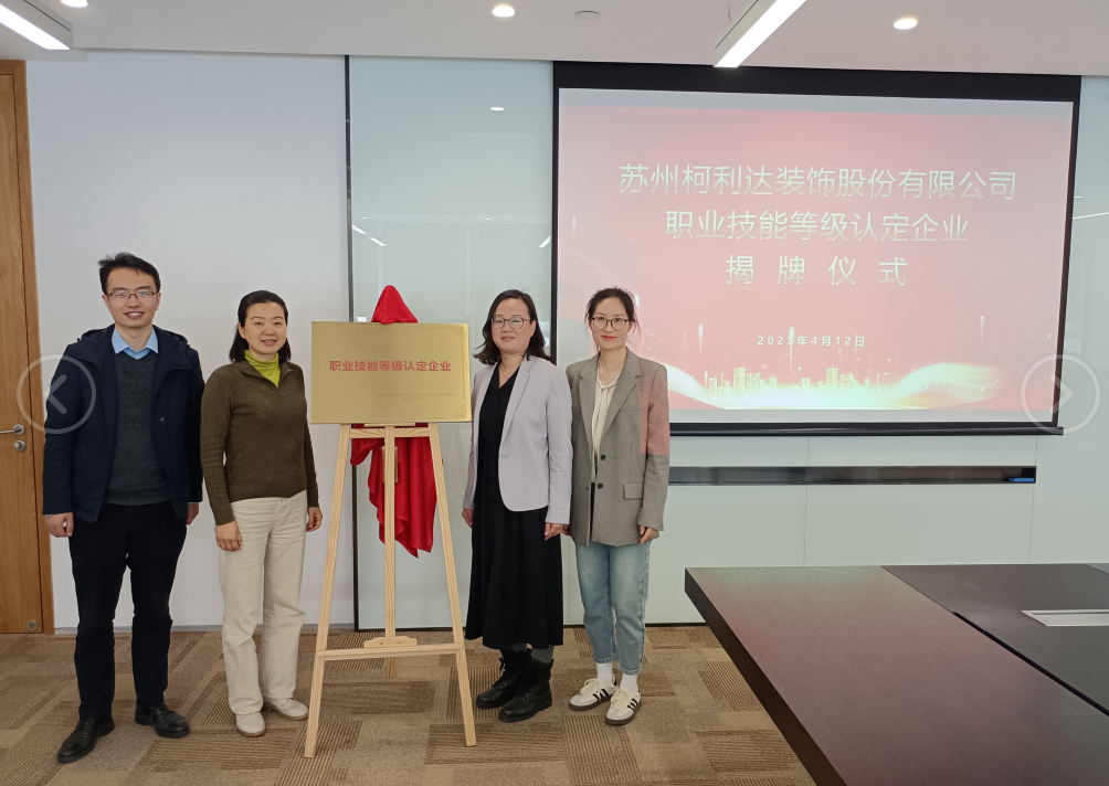4月12日,蘇州柯利達裝飾股份有限公司在研發(fā)大樓舉行“職業(yè)技能等級認定企業(yè)”揭牌儀式,蘇州市高新區(qū)獅山橫塘街道組織人事和社會保障局局長周麗平、柯利達人事總監(jiān)嚴琳出席揭牌儀式。
